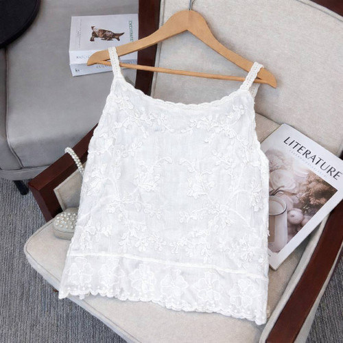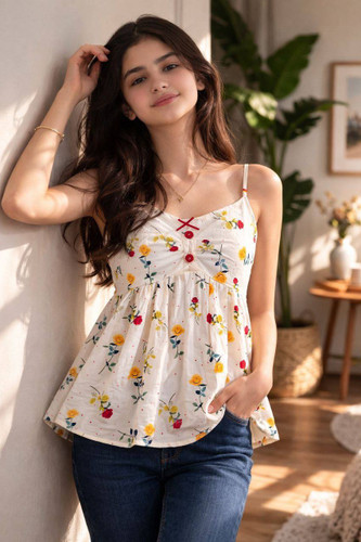 کراپ تاپ گلدار زنانه با بند ظریف و یقه گیپور – کیفیت عالی و تن‌خور جذب