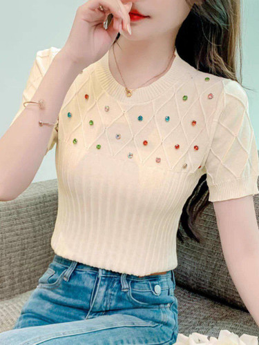 بلوز بافت آستین کوتاه نگین دار/ رنگبندی دارد (۲)