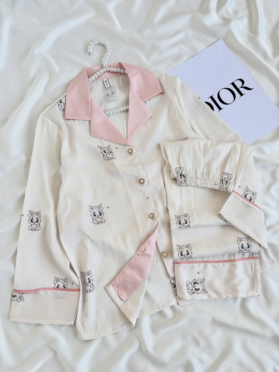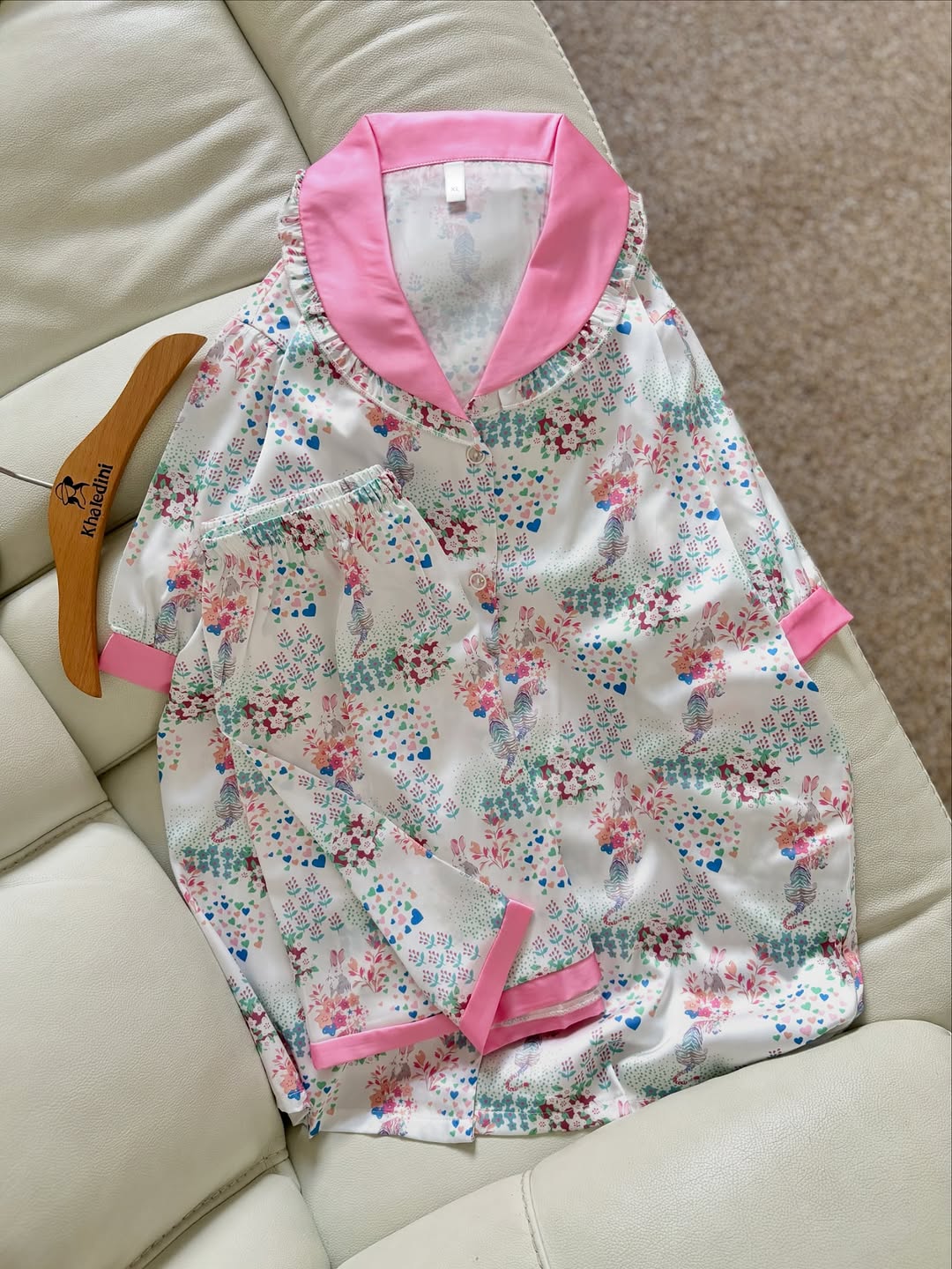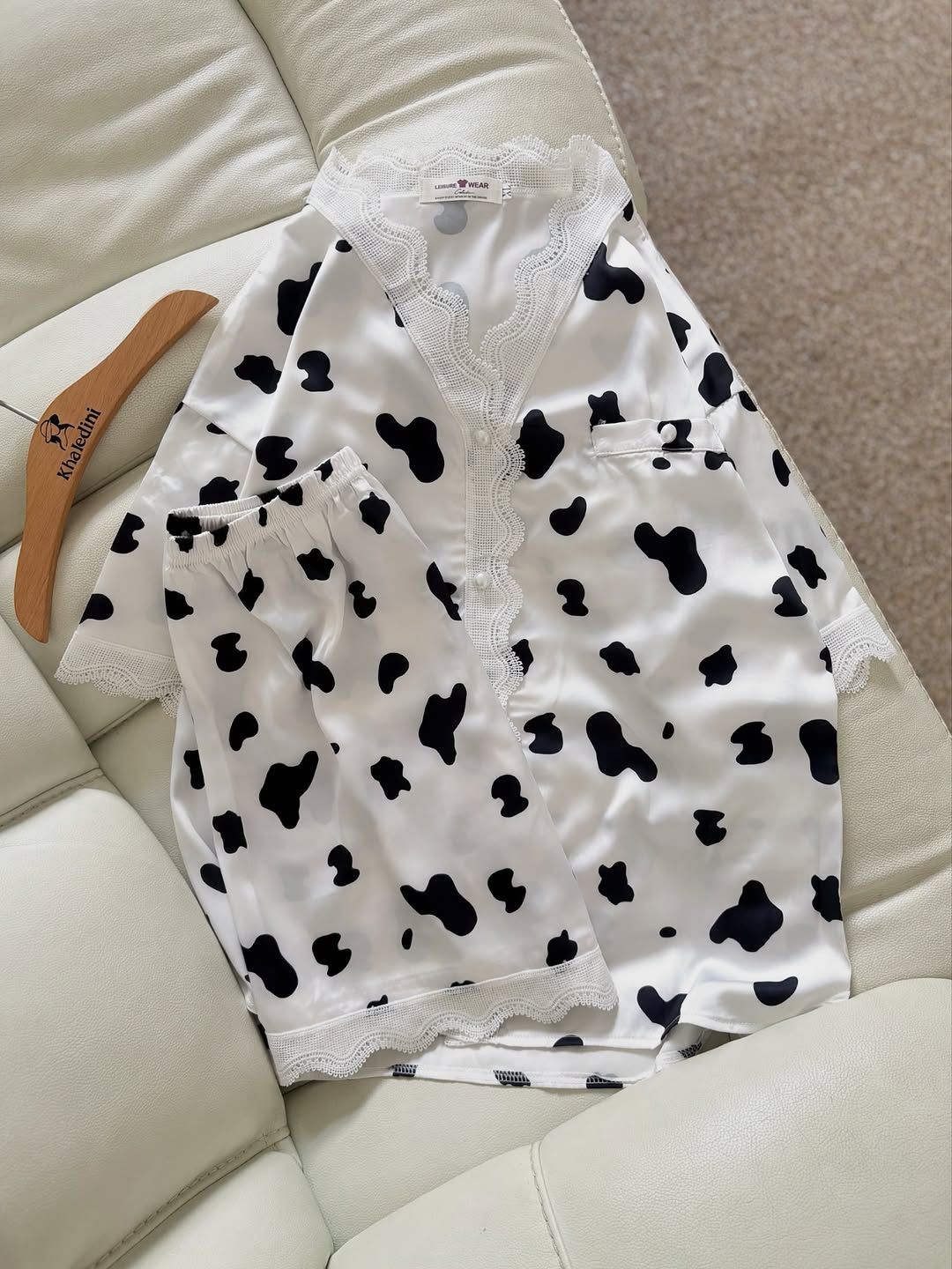 ست بلوز شلوار ساتن آستین کوتاه (طرح بندی دارد)