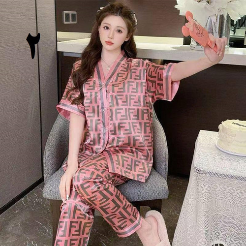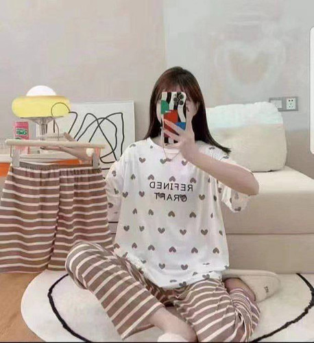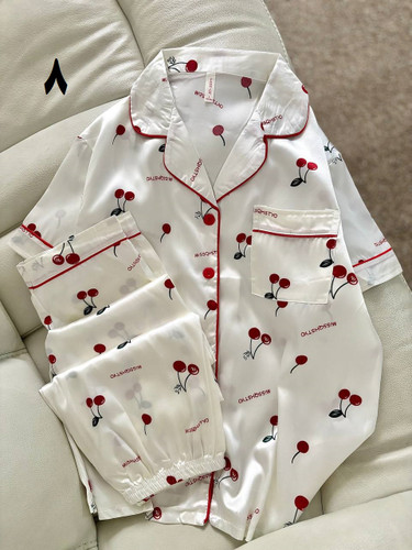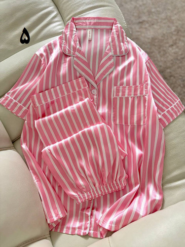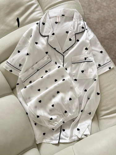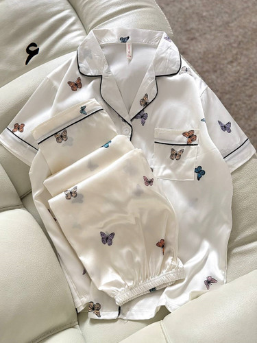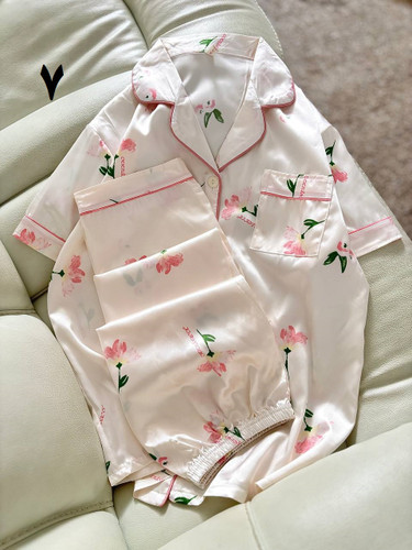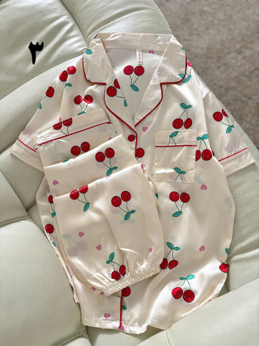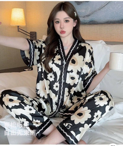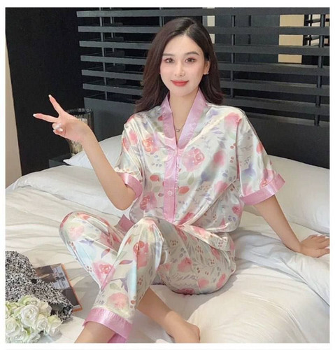 ست بلوز شلوار ساتن آستین کوتاه (طرح بندی دارد)