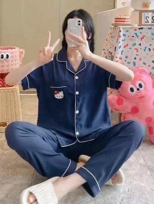 ست دو تیکه تیشرت و شلوار موسلین طرح کیتی رنگ سرمه ای سیر