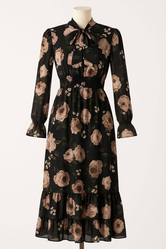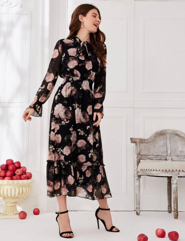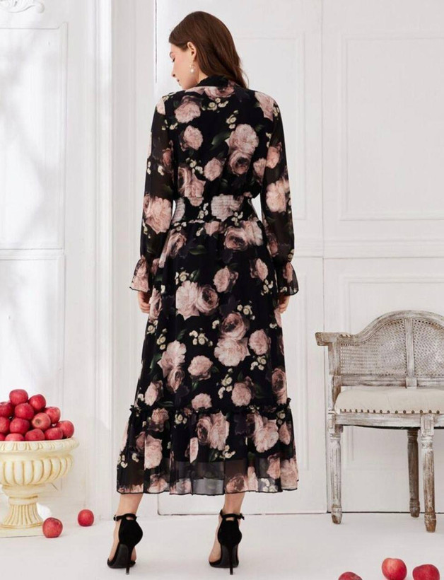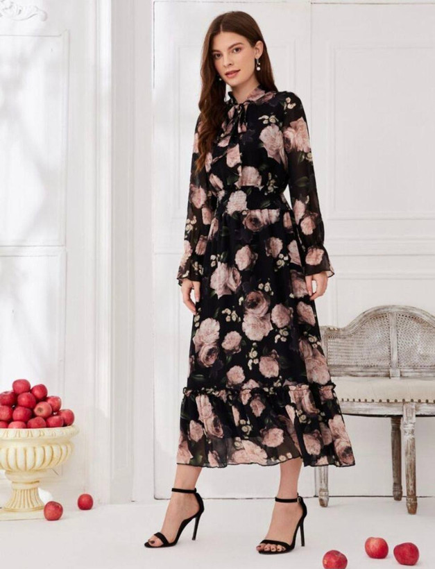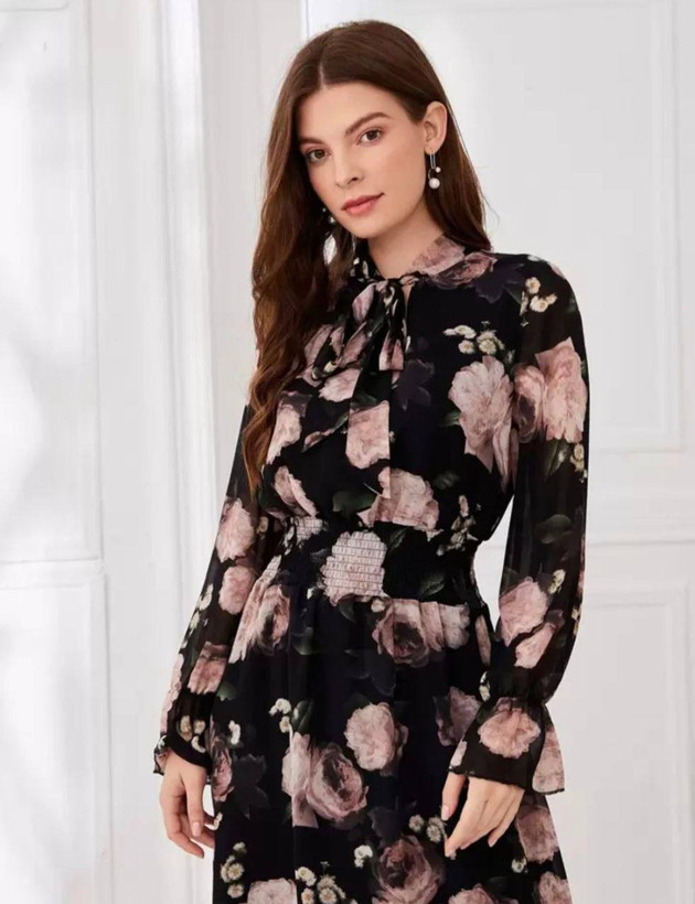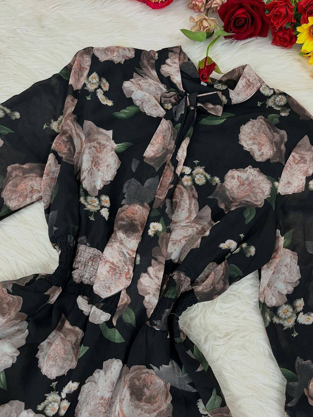پیراهن مشکی گلدار یقه کراواتی (۲)
