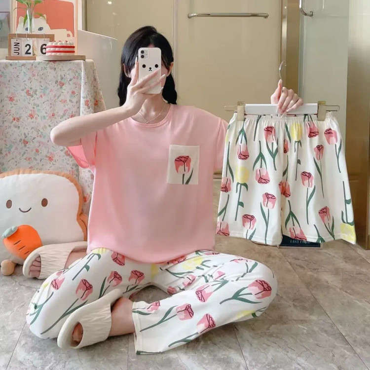 ست راحتی زنانه، ست سهتکه تابستانه، لباس راحتی دخترانه، ست خواب زنانه طرح گل، ست راحتی فانتزی، لباس راحتی تابستانه، پایجامه گلدار دخترانه، شلوار و شلوارک راحتی زنانه، تیشرت و شلوار زنانه