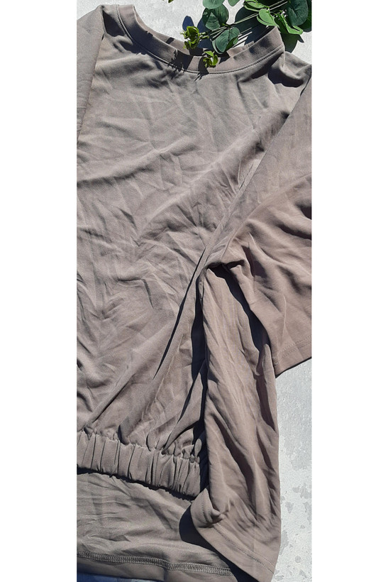 - تیشرت نسکافه ای پایین کش سایز فری ۳۸ تا ۴۸ ( عرض سینه ۵۲ بلندی جلو ۵۴ بلندی پشت ۶۲)