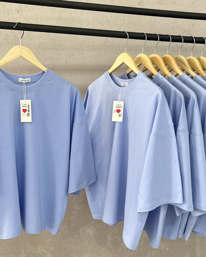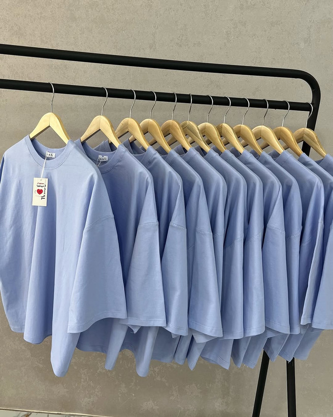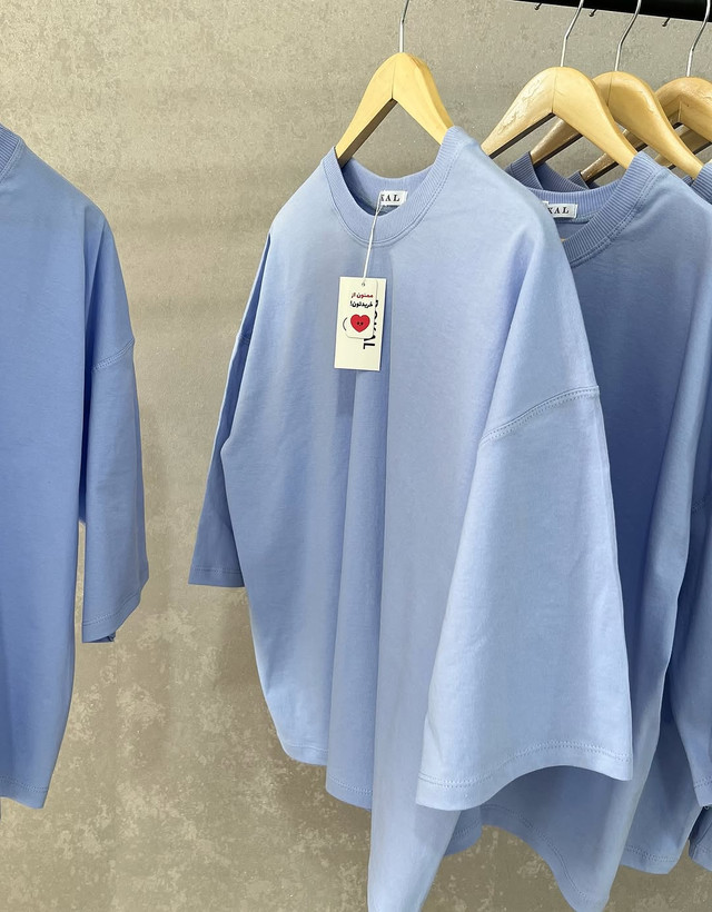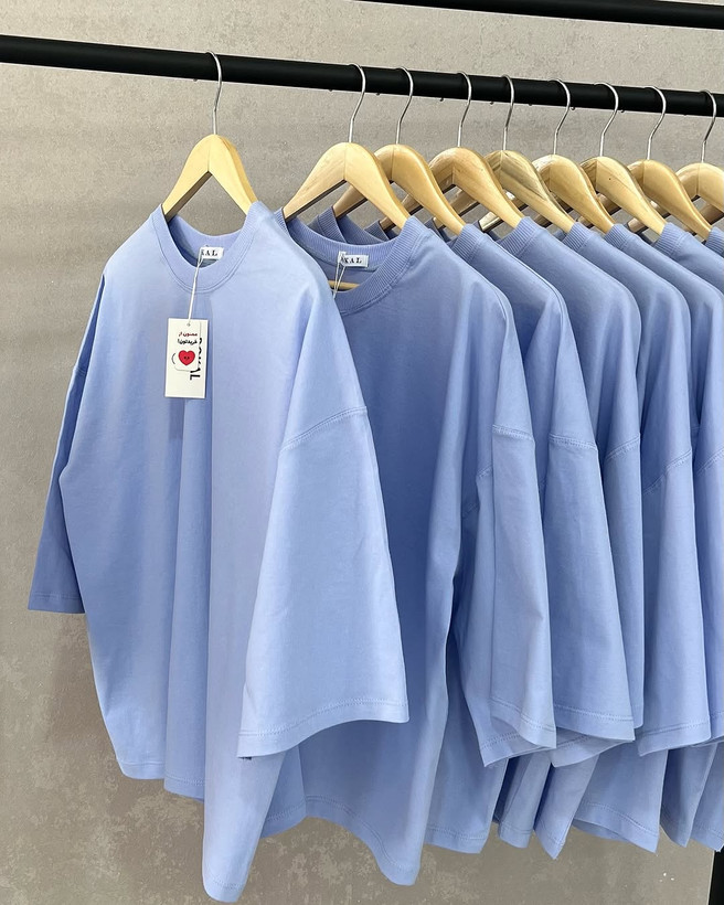 خرید تیشرت باکسی آبی مه آلود با استایل آزاد و فری سایز، مناسب خانمها و آقایان. دوخت حرفهای، کیفیت بالا و ۱۰۰٪ پنبهای