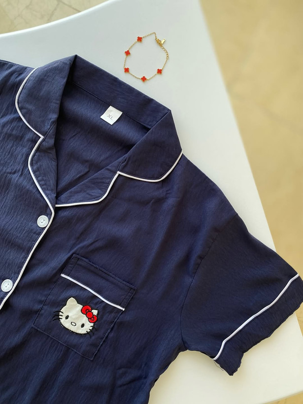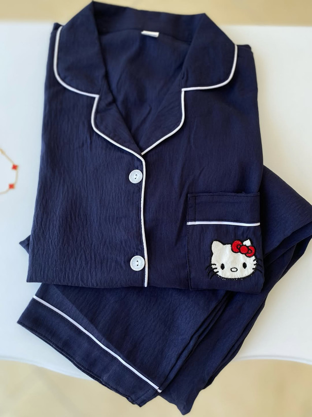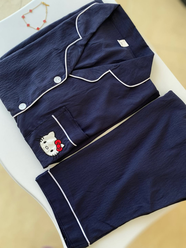ست دو تیکه تیشرت و شلوار موسلین طرح کیتی رنگ سرمه ای سیر