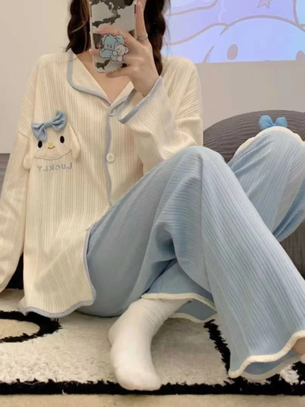 ست لباس راحتی زنانه و دخترانه دو تیکه بلوز آستین بلند دکمه دار و شلوار کریشه
